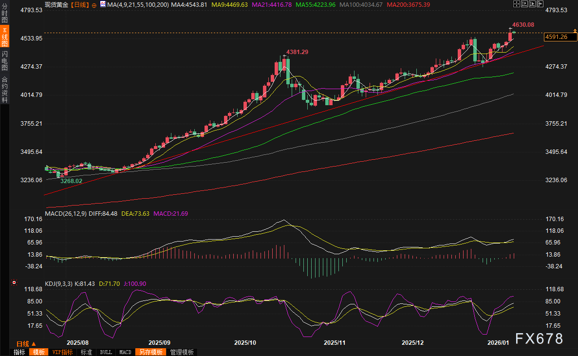 在全球金融市场风云变幻的2026年初,黄金价格犹如脱缰野马,一举突破每盎司4600美元的历史关口,创下令人瞠目结舌的新纪录。这一波金价暴涨,不仅点燃了投资者的避险热情,更揭示了地缘政治不确定性与美联储政策动荡交织下的市场深层逻辑。作为传统避险资产的黄金,正处于前所未有的强势周期中,其背后的驱动力量值得我们深入剖析。从鲍威尔刑事调查的突发事件,到美元疲软和通胀预期,再到全球地缘紧张局势的持续发酵,这些因素共同铸就了黄金的黄金时代。周二(1月13日)亚市早盘,现货黄金高位震荡,目前交投于4590美元/盎司附近。