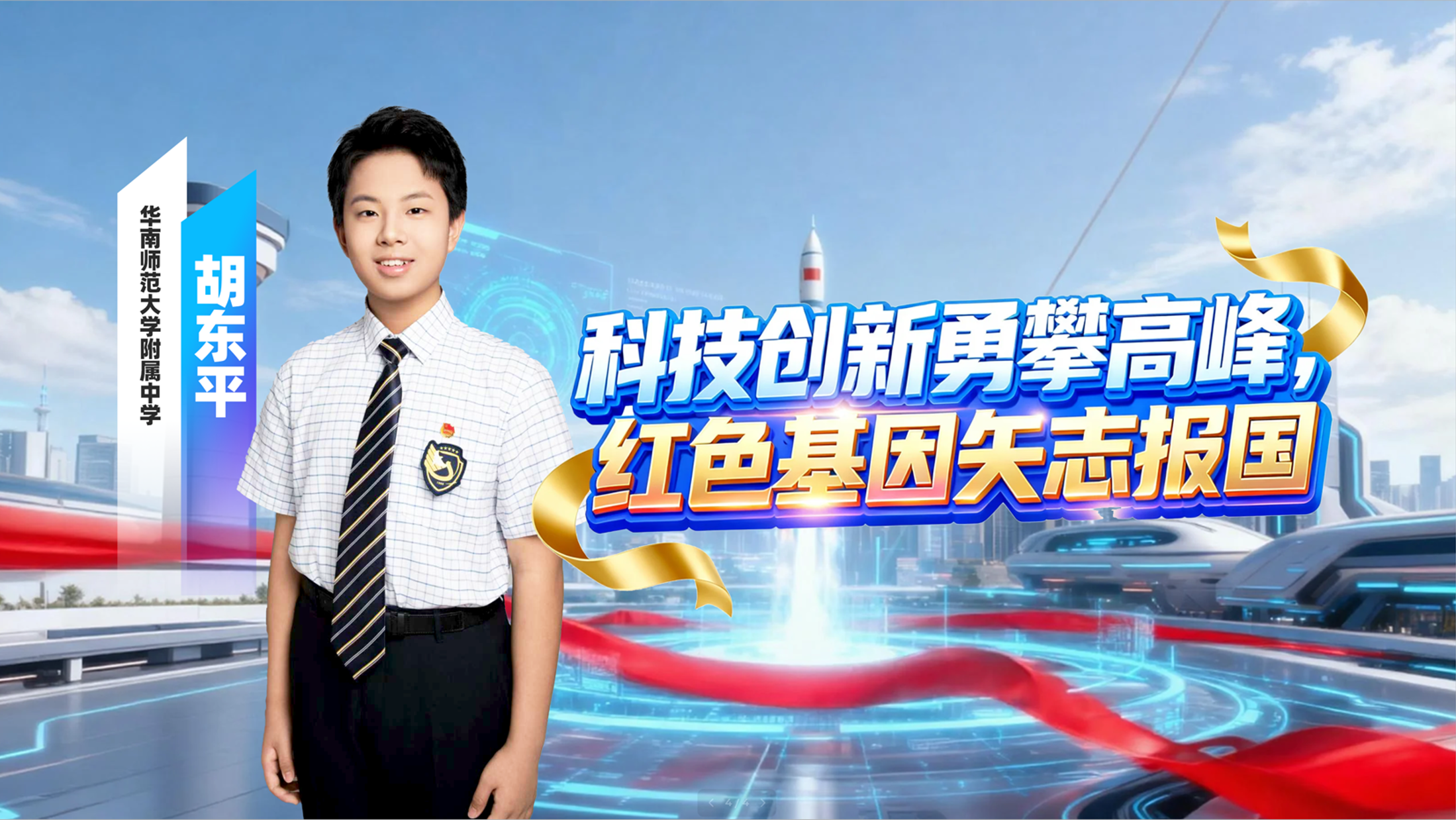 胡东平,男,华南师范大学附属中学初三学生。作为军人后代,他秉持“科技报国”理念,手握46项国家奖项、105项市级以上荣誉及多项个人专利,其发明的“跪姿智护机器人”“洗浴床机器人”等民生项目已投入实际应用。入选2025年全国“新时代好少年”,荣获“红领巾奖章”五星章、“最美南粤少年”等称号,2022年以小学组第一名获“中国青少年科技创新奖”(中国青少年科创最高荣誉)。