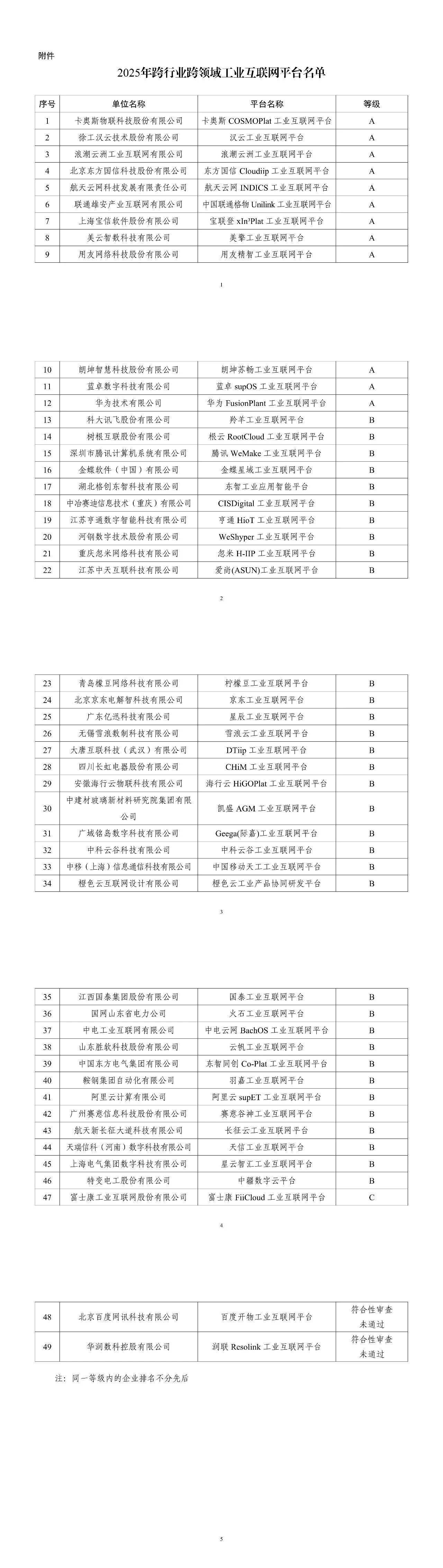 工信部从2019年正式开展“双跨”平台遴选工作5策略,2024年公示的“双跨”平台名单首次分级,共分为A、B、C 三个等级,A级为工业互联网“双跨”平台中各方面表现更优质,B级为工业互联网“双跨”平台的基本面。